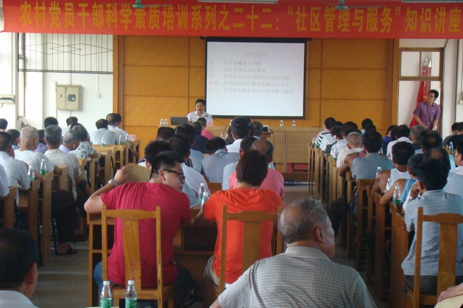 赵教授着重讲述了农村社区建设、城市化过程农村社区向城市社区的过渡、社区管理与服务的模式及管理创新等方面的问题并就当前社区建设中存在的问题与党员干部进行了交流。