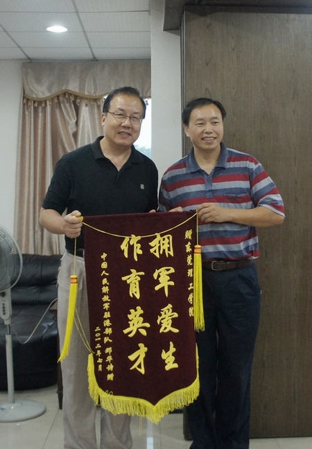 母校恩情永难忘。7月27日,在“八一”建军节来临之际,现服役中国人民解放军驻香港部队的我院文学与传媒系艺术设计专业邓华诗同学,不忘母校的培养和恩情,特意委托父亲从广州赶至东莞,为学院赠送了“拥军爱生、作育英才”的锦旗。学院党委副书记章德胜代表学院接受了锦旗。