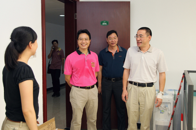 黎建烨(左二)、杨敏林(右一)与看望搬入行政办公楼的工作人员