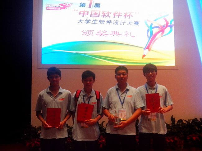 “中国软件杯”大学生软件设计大赛由工业和信息化部、教育部、江苏省人民政府联合举办,今年为第一届。本次大赛历时5个月,于8月底结束。大赛采用命题形式,全部题目均来源于软件企业生产过程中的实际问题,有些是业界迄今没有很好解决的问题。此次大赛堪称中国软件行业中规格最高、最具影响力的顶级软件大赛。全国共有500所院校4500余名大学生报名参赛,其中“211”类和“985”院校参赛队占49%,共有100支队伍进入决赛。最后20强争1个特等奖和4个一等奖。特等奖和一等奖由中科院软件所(研究生)、清华大学、南京航天航空大学等五所院校分别获得,我院王浩亮老师带领09级软件工程名为“蜂”队的莫栋鸿、袁卓航、刘慧鹏3名学生设计的“基于安卓的移动应用开发”获得二等奖,同时获得二等奖的还有华南理工大学等队。