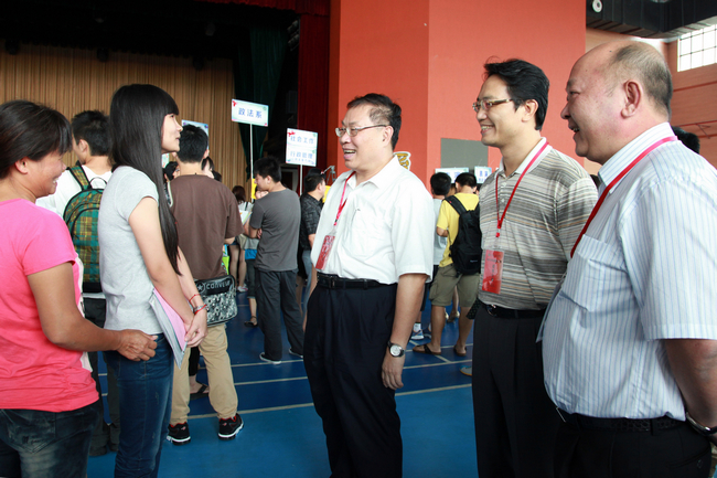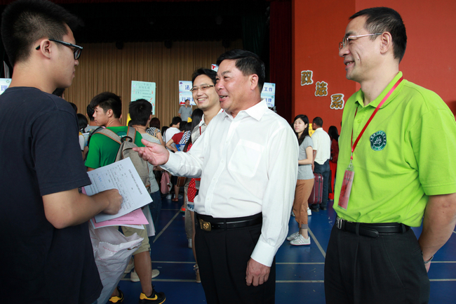 党委书记成洪波(中)与报到新生亲切交谈(张少炎摄)