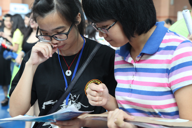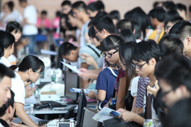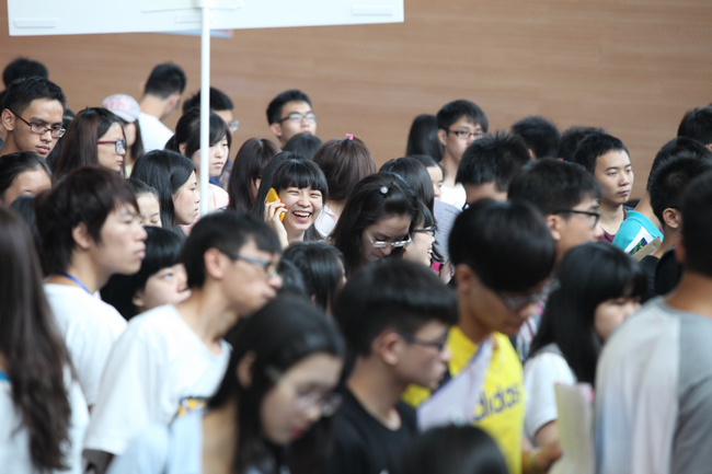 在入口,家长跟在学生的后面,像小学生中学生报到一样,直接跟随小孩进去,可是这次都遭到工作人员及礼仪小姐的劝阻:“你的小孩已经长大了,他一个人去报到就可以了。”大部分家长表示理解,就会说,“好吧,你自己去,我在外面等你”。为了让新生在城院的第一天就开始有独立自理的意识,维持好综合馆里面的秩序,工作人员便要求家长在外面等候,让学生自行报到。