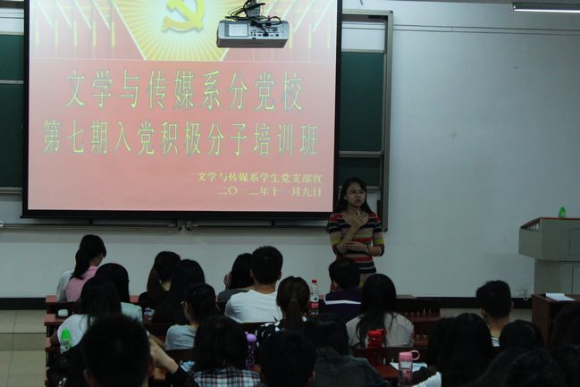 11月9日,文传系在7B208教室举办第七期入党积极分子培训班,组织200多名学生学习胡锦涛同志在十八大开幕式上的讲话。