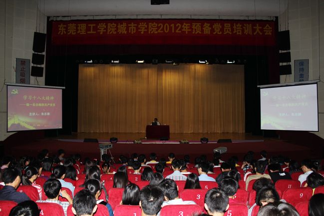 11月22日,城市学院党校在莞城校区大礼堂举办预备党员培训班,集中学习党的十八大精神,430多名预备党员和45名2012级新党员参加了培训。党委书记朱志德为同学们做了学习十八大精神的辅导报告。