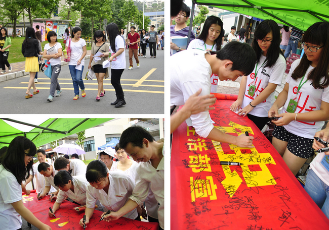 为积极响应教育部《关于在高等学校开展反对餐桌浪费专项行动的通知》的文件精神,5月9日,学院后勤公司饮食服务中心和学生会生活部联合在“学3”校道旁开展“光盘行动”的倡导活动。志愿者们现场派发宣传单,邀请同学们在“天地‘粮’心,珍惜莫蚀”横幅上签名。倡导活动得到同学们的积极响应,纷纷签名支持。
