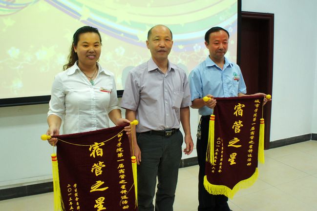 会上,翟处长还为4月份由学生投票和学生处、宿舍管理服务中心审核同意莫琼等7位宿管员颁发“宿管之星”的荣誉锦旗,柳副经理为获得“宿舍公益文明标语大赛奖”的学生代表颁奖。