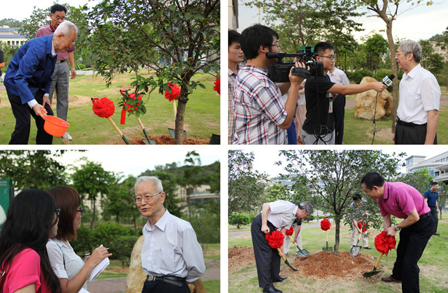 5月30日,中国科学院、中国科学院工程热物理所研究员徐建中院士与蔡睿贤院士,在院长杨敏林教授等院领导的陪同下参观校园,为桂花树培土浇水。