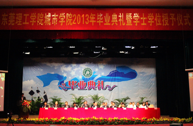 主席台布置得庄严喜庆,金色的天幕将会场映衬得辉煌灿烂。在主席台就座的领导和嘉宾有:东莞理工学院党委副书记吕琦元,城市学院董事长麦照容、董事黎建烨,城市学院领导杨敏林、朱志德、朱冰、张林、陈丁堂、章德胜、高香林、麦琦琳,各教学系部主任也在主席台就座。