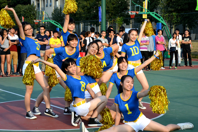 在我院篮球文化节上,最让人觉得耳目一新的便是身穿蓝色号码服的文传系的篮球宝贝们了,她们腕上系着漂亮的蓝色丝带,手上举着金色的丝球,在阳光下跳跃着、闪耀着,冲击人们的眼球。