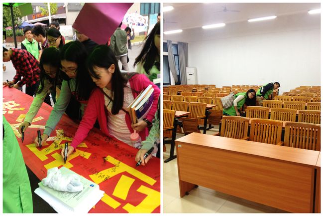 活动期间,机信系志愿队组织志愿者到7号教学楼对每间教室进行了清洁,并在校道设点宣传保护教室环境的理念。本次主题活动得到了全院师生的积极响应,许多同学在宣传横幅上签名,承诺加入到保护教室环境的行列中,共同创造良好的教室学习环境。