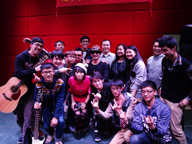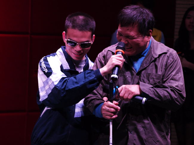 据悉,这些盲友是来自四面八方平凡而普通的盲人志愿者,他们为大家带来了一场精彩高雅、催人泪下的晚会:被誉为“寮步阿炳”的刘泽林师傅与城院学生带来的二胡合奏,优美动听;由曾闯入央视《星光大道》全国七强的盲友游建伟唱响的《一路有你》,深情款款;毕业于我校行政管理专业的盲人社工叶照明师兄《红日》,引得师弟师妹们齐声和音;而来自香港的“MUSIC IS HARMONY”盲人伤健乐队的激情旋律更是将全场的气氛带至高潮。