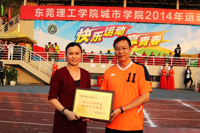 在闭幕式上,学院办公室主任黄兢将一块“热心公益事业,关爱学生健康”的牌匾赠,送给东莞市天使医疗投资有限公司副总经理李毓霞女士,用以感谢该公司对运动会的大力支持。据悉,今年共有三大公司友情支持校运会。东莞市天使医疗投资有限公司赞助赛场四周的横幅还特别制作了“活力城院人,健康新生活”的横幅标语,激励城院有更多的师生参与户外运动。同时,还提供了200箱矿泉水。红牛饮料销售有限公司东莞分公司为我院篮球文化节和本次校运会提供了40顶帐篷、凯乐石服饰有限公司赞助裁判员服装250多件。