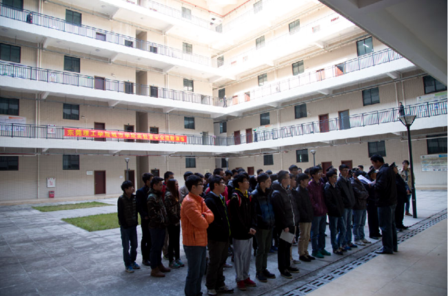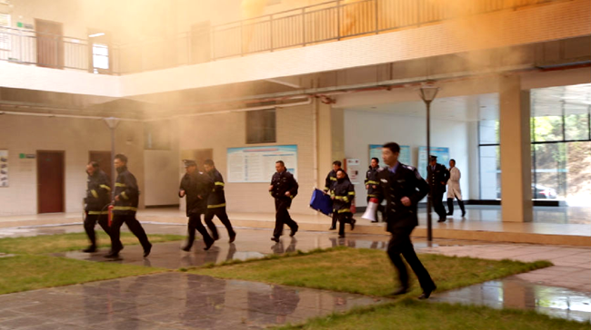 “全体师生请注意,3B实验楼发生火灾,请大家不要惊慌,不要乘坐电梯。按老师的指挥有序安全撤离……”随着广播发出阵阵警笛声,实验楼全体学生在老师和工作人员的指引下,有序而快速地向安全区域撤离。工作人员随即拨打119报警,消防官兵随后到达现场,迅速展开“灭火救援”。最后,在消防官兵和全体师生的紧密配合下,人员全部撤离至安全区域,“大火”被及时扑灭,演练取得圆满成功。