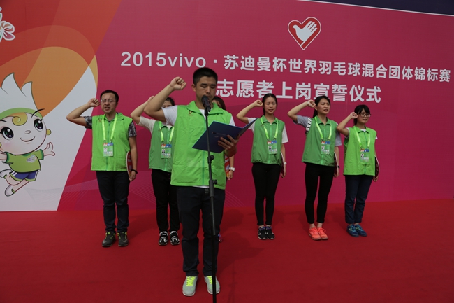 2015年VIVO?苏迪曼杯世界羽毛球混合团体锦标赛即将开赛,4月29日上午,我院300多名志愿者们参加了在东莞市篮球中心广场举行的志愿者上岗宣誓仪式。财经系丘嘉文同学带领全市600名志愿者宣誓。
