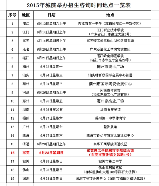 据悉,为了使考生和家长更充分地了解我院招生政策、教学和学生管理情况、意向专业、就业等问题,指导考生科学合理填报志愿,从6月13日起,我院已奔赴各省市,陆续开展2015年招生咨询(具体各省市招生咨询的时间地点见下表)。特别值得一提的是,东莞市2015年普通高等学校招生咨询会将于6月28日在我院综合馆举行,届时将有100多所来自全国各地的普通高等院校参加。我院各项筹备工作已在有序开展之中。