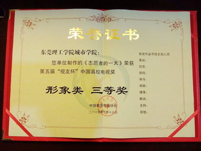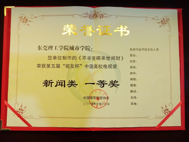 据悉,本次“中国高校电视奖”大赛共收到来自北京大学、清华大学、中山大学、华南理工大学等90多所高校的256件作品,分别参加新闻类、专题类、教学类、微电影类、形象类、综艺类等六个类别的评选活动。其中,我院大学生媒体中心梁施燕同学作品《不辛苦哪来世间财》在89个新闻类参赛作品中获一等奖,汪锦振团队作品《志愿者的一天》在44部形象类参赛作品中获三等奖。