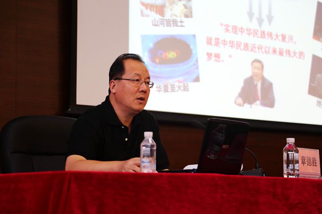 第二讲由学院党委副书记、院党校校长章德胜主讲。章副书记以“中国梦与中国精神”为主题,从“回顾历史、把握现在、实现路径、展望未来”等四个方面阐述了“中国梦”的缘由、内涵和特点,通过 对“我的梦”与“中国梦”之间的辩证关系分析,让同学们更加深刻地了解爱国主义的精神实质。他以“成为中国梦的中间力量”勉励学员,并要求大家加强自身的党性修养,提高自身的政治觉悟。