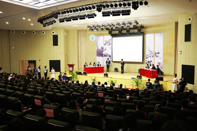 模拟招聘会在院党委副书记章德胜热情洋溢的致词中拉开序幕。比赛共分5个环节:自我展示、职场问答、专家点评、岗位推荐和专业评分。