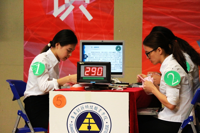 本次大赛共有来自东莞理工学院、广东创新科技职业学院、广东科技学院、东莞职业技术学院和我院的五支队伍,通过“有问必答、计算技能比拼、快速点钞、会计实操、急速抢答、风险题”等六个环节进行一比高低。经过激烈角逐,我院以565分获一等奖,东莞职业技术学院、广东科技学院获二等奖,广东创新科技职业学院、东莞理工学院获三等奖。