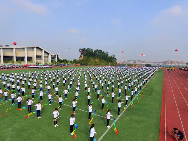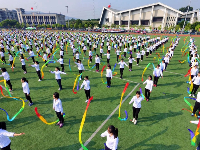 随后,传统团体操表演把开幕式推向了高潮。以“和谐中国”为主题的呼啦圈表演,“幸福城院”为主题的花球啦啦操表演,“悦动生命”为主题的跳绳表演和“彩色畅想”为主题的彩带表演,可谓精彩纷呈,复杂的队形变换、动感的舞步、青春的跳跃、缤纷的彩带随风飘扬,尽情地展示了我院学子的青春活力与运动之美。