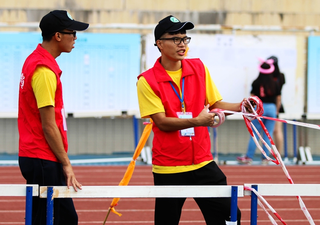 裁判组:为时两天的运动会当中,每一次场比赛,每一个角落,必定少不了他们的身影。跑道旁,他们拉起防护栏为运动员们开辟一方赛场,为每一场赛事记分,为长跑运动员送水,尽职尽责。