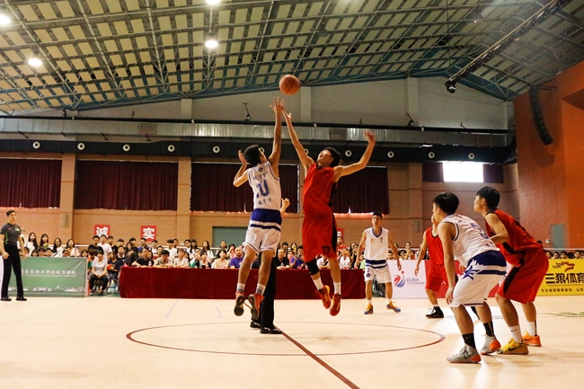 易边再战,我院“里突外投”,利用强悍的防守,反击快攻频频得手,将比赛节奏牢牢控制在手。比赛进行到第三节8分钟时,出现了小插曲,主队9号叶志城在拼抢篮板时倒地,下巴挫伤退场。最后时刻,创新学院欲奋力直追,但为时已晚,我院最终以77:50力克创新学院,获得主场三连胜。