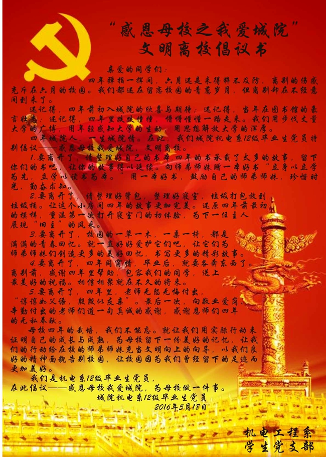 通过短片,机电工程系2012级党员希望传达文明离校的思想给每位城院毕业生,并倡议大家——“我爱城院,文明离校,为母校做一件事”。