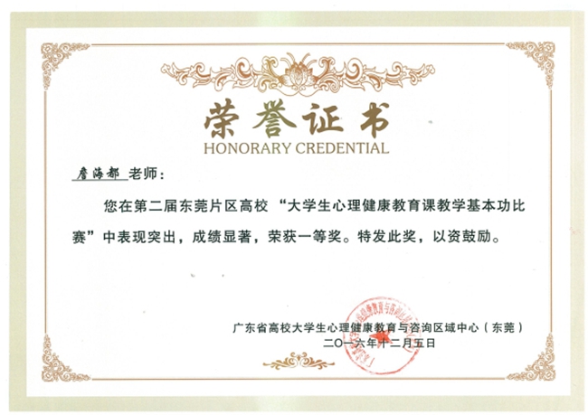 近日,从广东省高校心理健康教育与咨询区域中心(东莞片区)的通知文件获悉,我院心理健康教育与咨询中心詹海都老师在第二届东莞片区高校“大学生心理健康教育课教学基本功比赛”中荣获一等奖。