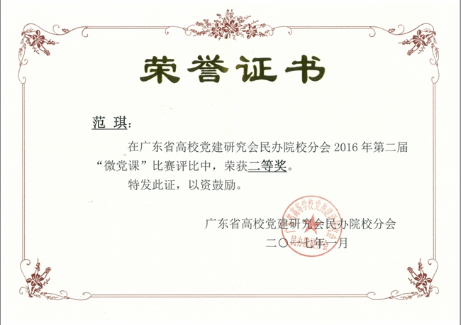 3月9日,广东省高校党建研究会民办院校分会2016年年会在广州工商学院召开。会议对2016年广东省民办高校第二届微党课比赛及高校党建研究会民办院校分会2016年优秀年会论文的获奖人员进行了表彰,我院范琪、孔青梅等同志的微党课分别荣获二等奖、三等奖,史雍真同志的论文获优秀年会论文二等奖。