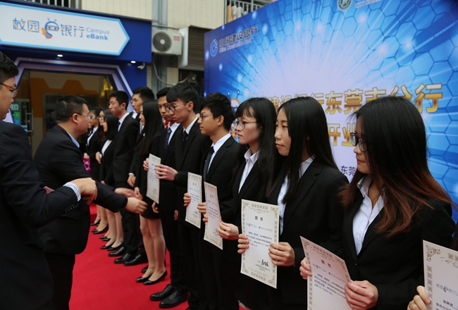 随后,秦泽发副行长为学生行长及学生团队干部颁发了聘书,并与章德胜副书记、周庆副院长、王磊副总经理一道为“校园e银行”进行了揭牌。