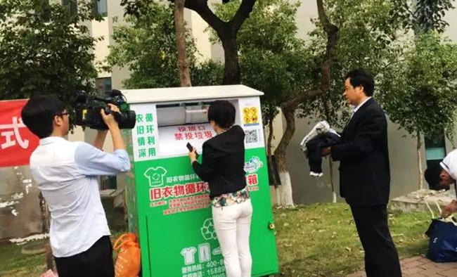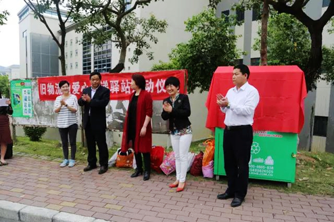 与会领导现场捐出了自己的旧衣物,以自己的行动来鼓励学生们对旧衣物进行回收利用。