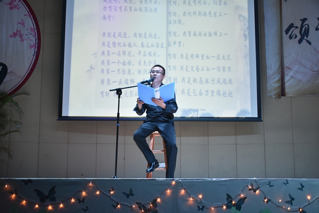 “数风流人物,还看今朝”,激昂慷慨的《沁园春?雪》彰显出老一辈无产阶级革命家的英雄气概。陈智勇抒情朗诵《寻梦》,伴随着优美的舞蹈,诗韵缓缓跃动。励志榜样李龙彪朗诵《梦想在远方》,再现了城院学子对梦想的坚持与追求梦想的决心。“风流才子”外语系主任王锦锋教授的一首《风流歌》,展现了一个风流才子的寻梦历程。李于旭同学与父亲的一生温情,发自肺腑的朗诵《不忍最是离别时》,再现离别相惜之景,让在场观众潸然泪下,使大家更加懂得“女行千里父担忧”的至爱情怀。充满爱心的《阳光》 “人间处处有真爱,人间处处有真情”, 更是让人感慨不已。
