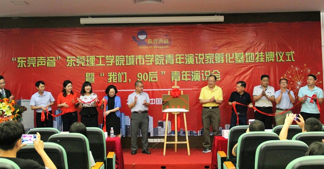5月16日下午,“东莞声音”东莞理工学院城市学院青年演说家孵化基地挂牌仪式,在行政楼112顺利举行。东莞市精神文明建设办公室梁杰副主任、东莞市国税局松山湖分局黄湘梅副局长、“东莞声音”发起人王德青等嘉宾,学院党委副书记章德胜,院长助理、创意设计学院院长林江龙及有关部门负责人参加了仪式。