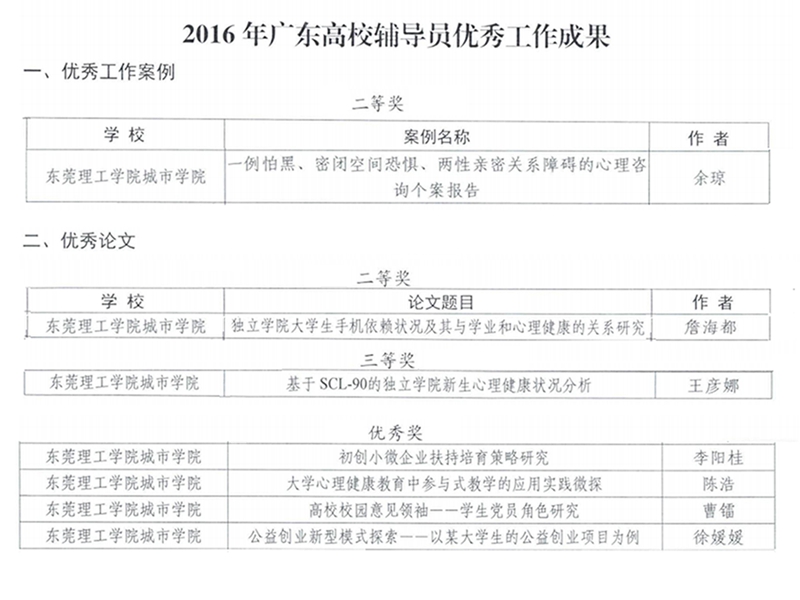 近日,广东省教育厅发布了《关于公布2016年广东高校辅导员优秀工作成果的通知》。我院学工团队共斩获7项奖项,包括二等奖2项、三等奖1项、优秀奖4项。