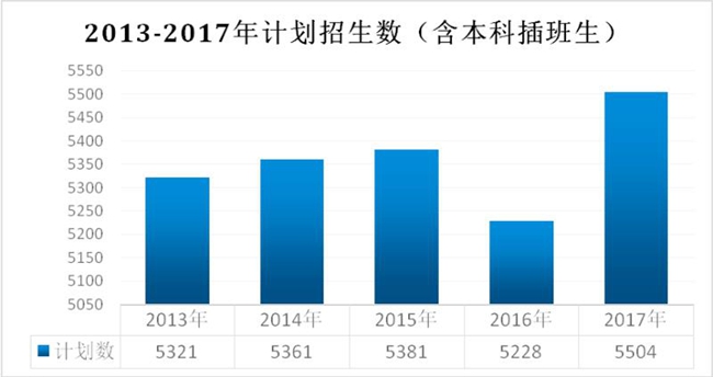 二是我院2017年整体招生计划为5504名,2017年本科插班生已完成招生354名。2017年普通招生计划5150名,创近年新高。