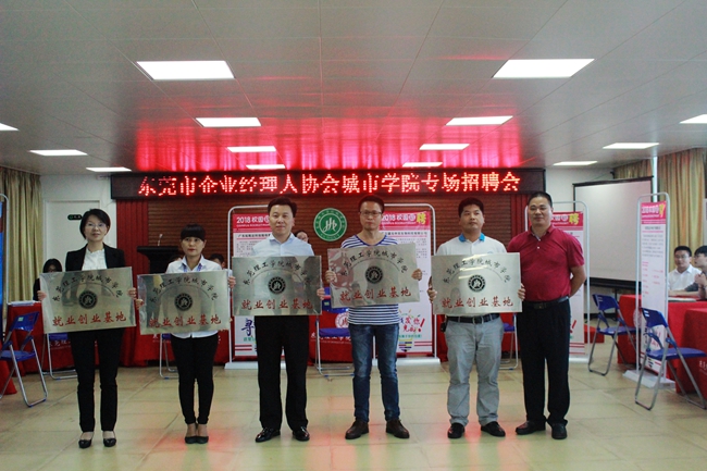 学院招生就业处孔增强处长向广东盛元中天生物科技有限公司、东莞市海陆通实业有限公司、东莞市嘉龙海杰电子科技有限公司、福德電子有限公司、东莞乐箭照明有限公司等5家东莞市倍增企业,颁发了“城市学院大学生就业创业基地”牌匾。