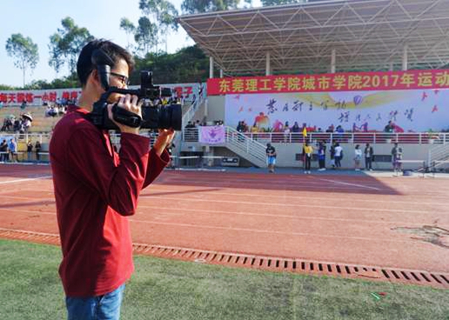 校运会正在火热进行,吸引了寮步电视台记者也来到现场进行采访报道。