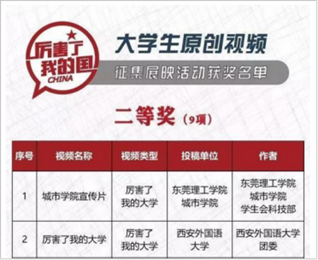由团中央学校部、全国学联秘书处、中央电视台财经频道于今年9月联合开展的“厉害了 我的国”——大学生原创视频征集展映活动,近日结果揭晓。我院学子作品《城市学院宣传片》荣获大赛二等奖。