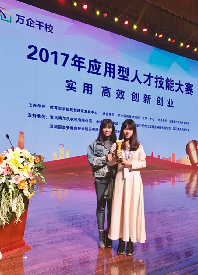 12月3日,由教育部举办的2017年应用型人才技能大赛在山东济南落下帷幕。在“匠心?民族魂”平面设计创新创意赛项目,我院创意设计学院2016级数媒3班张乔同学获得一等奖,2016级视传1班符海承同学获得三等奖,指导老师俞敏荣获“优秀指导教师”称号。