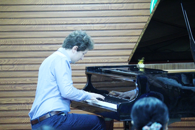 晚上,马帝欧?斯坦佩克教授和师生共同完成了一场精彩的音乐会。他即兴演奏了法国作曲家拉莫的舞曲风格、讲述爱情故事的肖邦叙事曲第三号和饱含精湛技术的拉克玛尼诺夫前奏曲。一首首动听的钢琴曲,让同学们随着音符沉迷其中。
