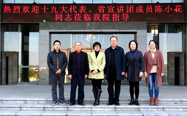 陈小花同志还传达了教育部、省教育厅学习宣传贯彻党的十九大精神的要求和精神,指出高校工作者要不忘教书育人初心,牢记立德树人使命,当好社会主义核心价值观的引领者,当好青年学生成长成才引路人,当好中华民族优秀传统文化的传承者、传播者,争做“四有”好老师,“做好党的十九大精神的学习者、教学者、宣讲者、践行者,努力做到学好、教好、传好、干好”。陈小花代表的生动报告赢得了阵阵热烈的掌声。
