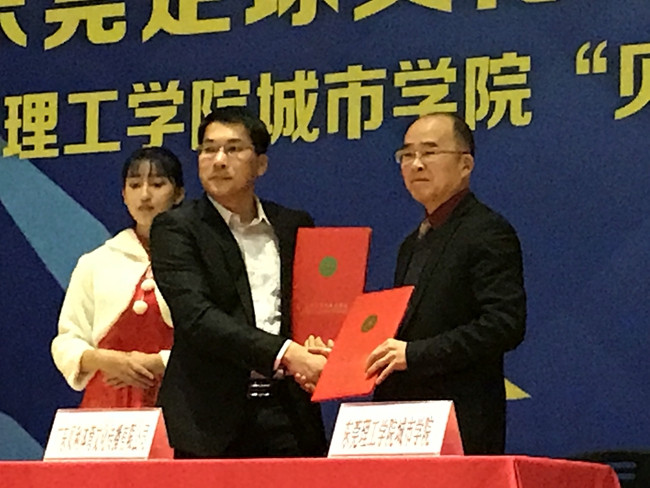 王卫平院长代表城市学院与广东贝利体育文化传播有限公司签署了“东莞理工学院城市学院贝利文体发展基金协议书”,并向广东贝利体育文化传播有限公司授予实践基地牌匾。