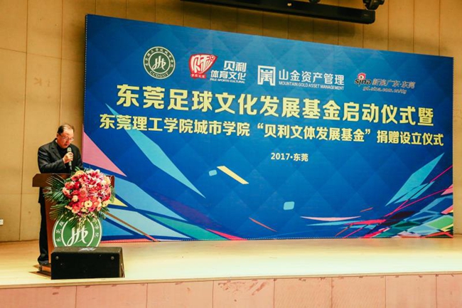 东莞市山金资产管理有限公司董事长、广东贝利体育文化传播有限公司董事吴志斌先生表示:东莞理工学院城市学院具有良好的足球文化氛围,各项体育教育取得不俗的成绩,培养出不少优秀的运动人才。广东贝利选择在城市学院设立文体发展基金,有利于发挥校企合作的协同效应,丰富各类文体项目,推进足球进校园,大力发展体育文化,特别是足球文化建设,推动足球文化产业的发展。他说,未来山金资产将投资一亿元,打造有影响力的本地足球文化品牌,致力于推动东莞足球文化产业发展。