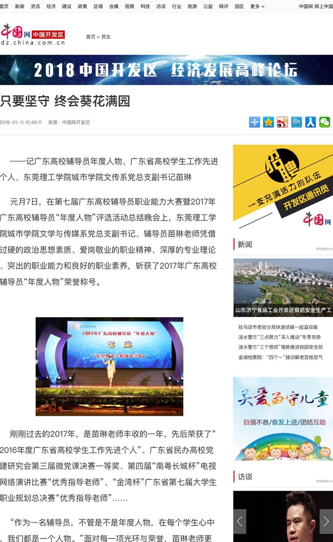 1月11日,中国网对我院文传系党总支副书记苗琳荣获“2017年广东高校辅导员年度人物”、“2016年度广东省高校学生工作先进个人”称号及先进事迹,进行了大篇幅的通讯报道。
