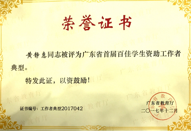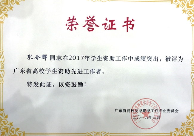 大会表彰全省高校资助工作2017年度先进工作者和资助工作者典型。我院孔令辉老师被评为2017广东省高校学生资助先进工作者,黄静惠老师被评为广东省首届百佳学生资助工作者典型。