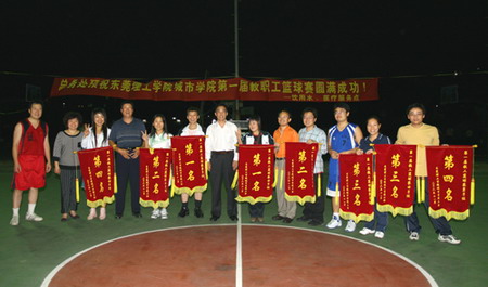 11月17日,城市学院首届教职工篮球赛决赛在教工球场拉开战幕。经过激烈的拼杀,女子,机关队9:6战胜总务处。男子,总务处80:43战胜机关队。比赛结束后,观看比赛的学院党委书记朱志德、常务副院长程发良教授、副院长林世俊教授、党委副书记朱冰等为获奖球队颁发锦旗。
