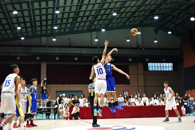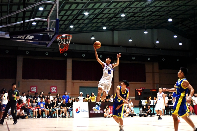 甫一开场,广科队率先夺得球权,13号张启帆拿下第一球。我方球队随即连连发动进攻,打出一波13∶0的小高潮。10号黄明健、19号叶锐城更是在队友的帮助下,连续突破打成2+1。半场结束时,我方以49∶23领先。
