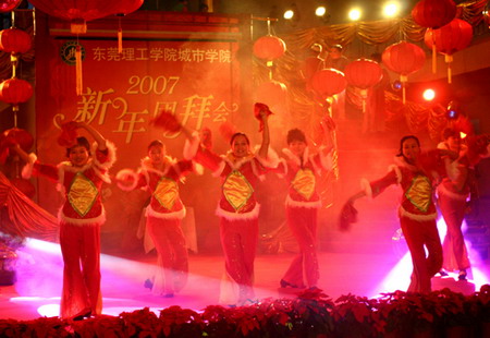 1月22日的大学生活动中心,张灯结彩,笑语欢歌,暖意融融。主席台上“恭贺新春”的印章衬底和各色花卉交相映衬,洋溢着浓浓的春意。城市学院2007年新年团拜会在这里隆重举行。中共东莞市委副书记刘树基同志,东莞市副市长周致纳同志,东莞理工学院历届领导,城市学院党政领导与500多名教职工及其家属欢聚一堂,辞旧迎新,互致问候,共贺新春佳节。