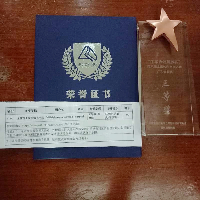 6月14日,第八届中华会计网校杯全国校园财会大赛广东省复赛在于在广东金融学院举行,来自省内16所高校财会学子参加了比赛。我院由冯晓玲、黄金凤、邓琼波同学组成的代表队荣获广东省赛区三等奖,指导老师鞠成晓、宋慧敏组被评为本次竞赛优秀指导老师。