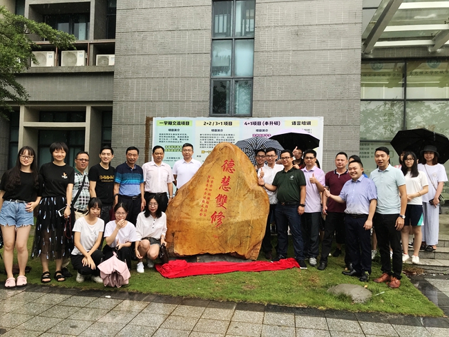 师生代表们共同为景观石进行揭幕。景观石安置于5A钟楼前,刻有“德慧双修”四个字,寓意着“修德行,修才慧”,寄望城院学子德慧双修。
